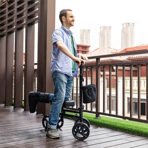 Note that all of our Elenker® products feature adjustable knee pad and handlebar heights to ensure you can dial in the most comfortable operating position with proper posture. Please see the images below which demonstrate proper posture. You will notice that the handlebar is set at waist height so the arms and hands are in a comfortable position. You can also see that the hips are even, with the uninjured foot flat on the ground, and the injured leg is at a 90 degree angle.