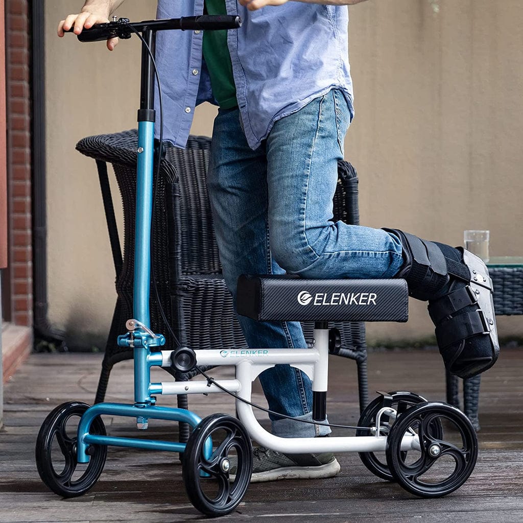 Finally, keep your ankle elevated "E", when you’re propping up your foot with a couple of pillows. When walking make sure your knee stays firmly situated on the soft cushion provided on your knee scooter.