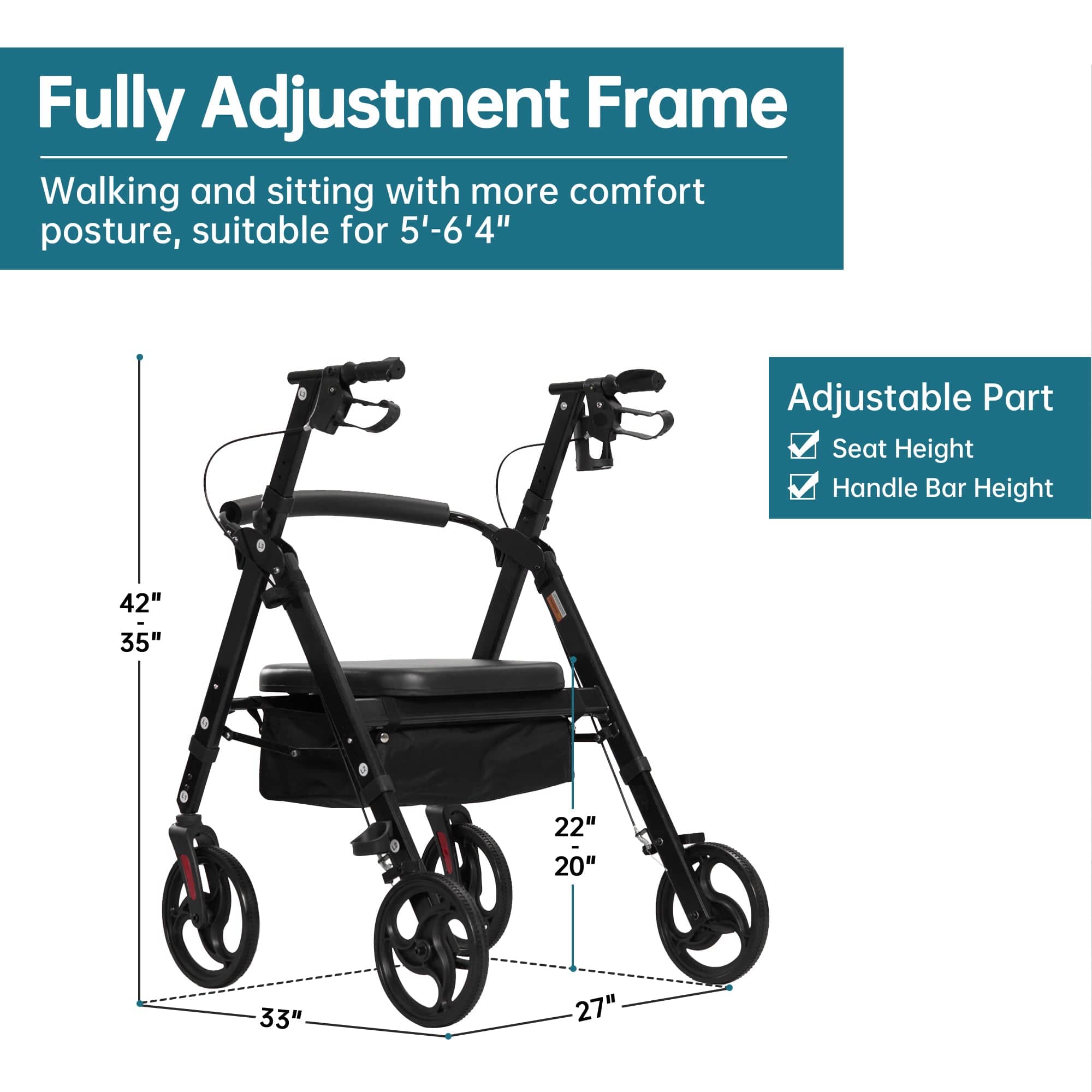 With a large under-seat basket, cup holder and cane holder, this rollator offers ample storage space to carry all your daily essentials conveniently while keeping your hands free.