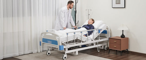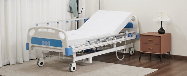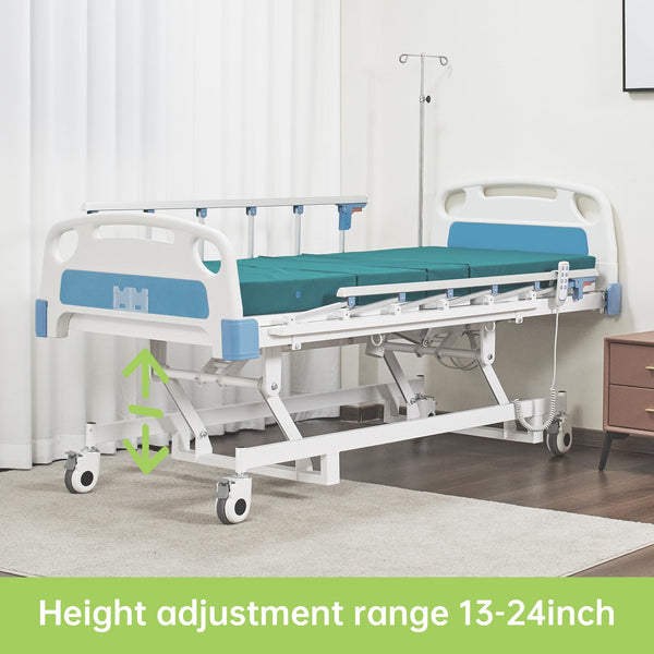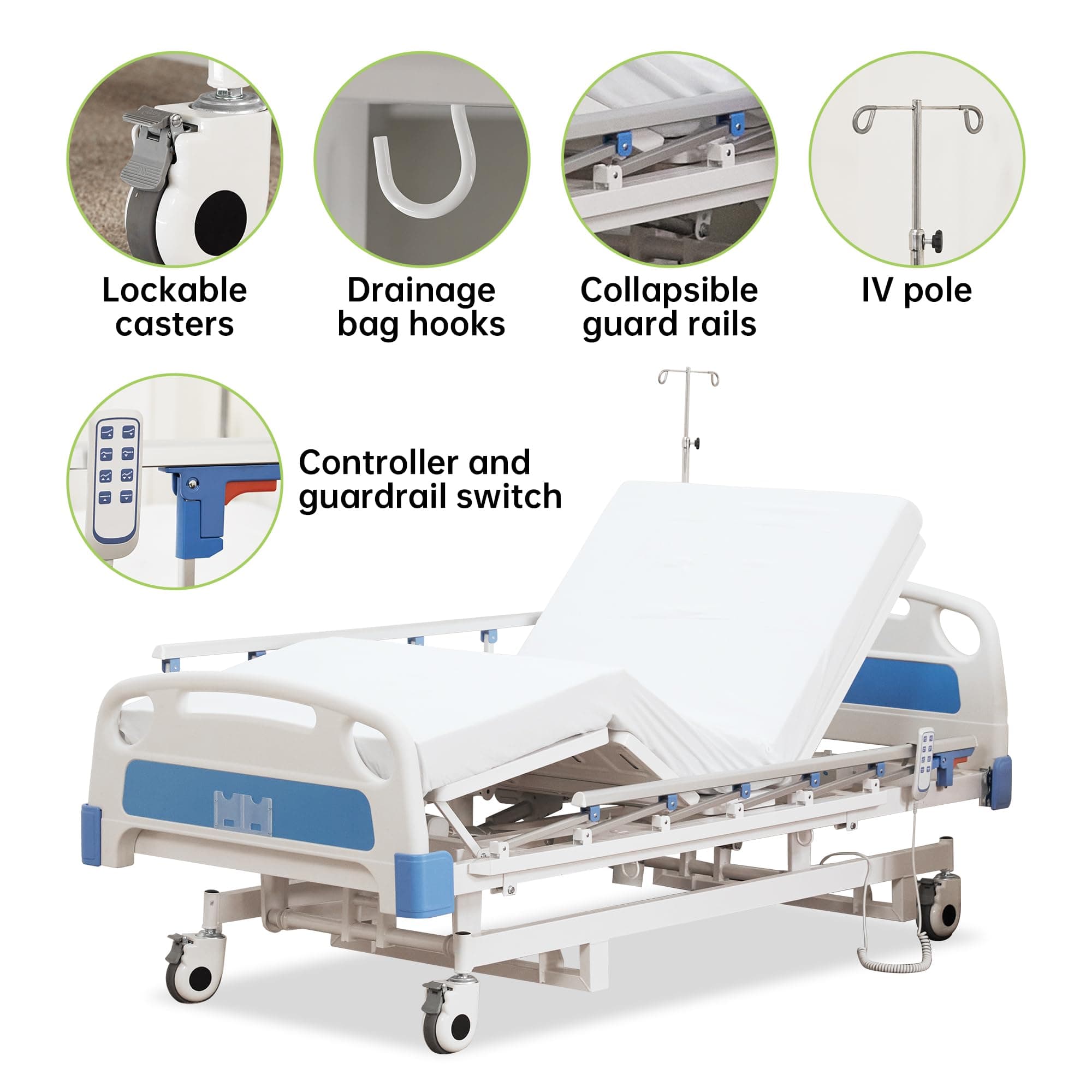 Equipped with lockable casters, drainage bag hooks, collapsible guard rails, IV pole and dual control options, this bed offers versatile functions for daily care needs.